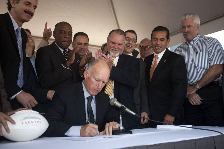LOS ANGELES – Taking action to fast-track the creation of thousands of jobs, Governor Edmund G. Brown Jr. today signed legislation to streamline environmental review for key construction projects. The two bills, signed during a ceremony at the proposed site of the Farmers Field stadium, are expected to drive hundreds of millions in economic investment while ensuring all projects meet California Environmental Quality Act (CEQA) criteria.