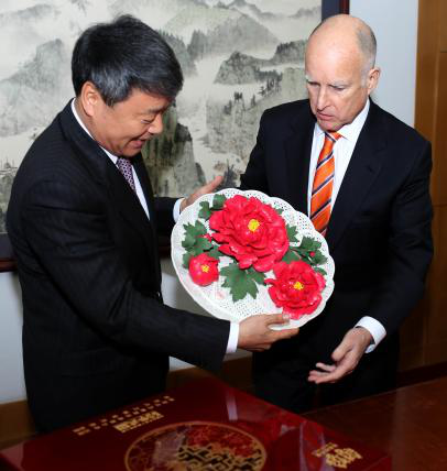 7.) Governor Edmund G. Brown Jr. is presented with a gift by China’s Chairman of the National Development and Reform Commission Xu Shaoshi.