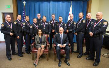 1.) Governor Brown and Attorney General Harris with Modesto Police Department honorees. From left to right: Officer Jonathon Griffith; Officer Gary Guffey; Officer Robert Reyna; Officer Frank Inacio; Chief Galen Carroll; Officer Richard Rodarte; Officer Joseph Bottoms; Officer Ivan Valencia; Sergeant Patrick Kimes; Detective Eric Beffa; Sergeant Rick Applegate; Sergeant Scott Myers