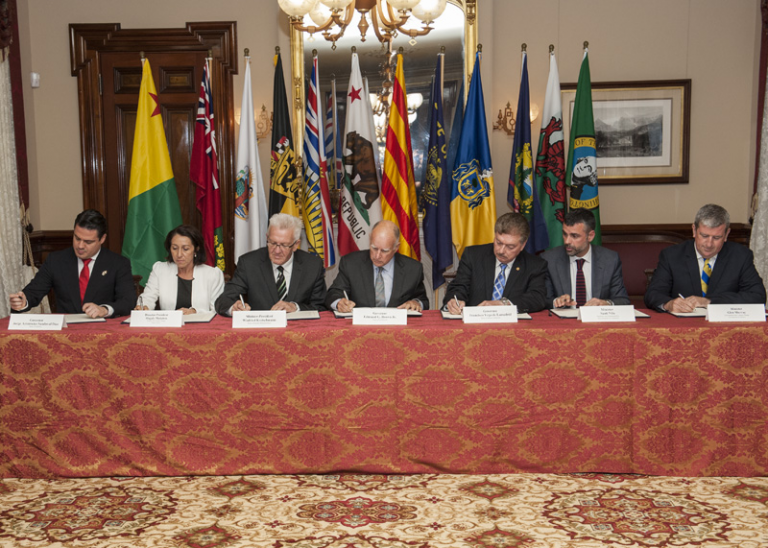 The 12 founding signatories to the agreement span seven countries in both advanced and developing economies on three continents and would collectively constitute the fourth largest economic entity in the world by GDP. The signatories include: California, USA; Acre, Brazil; Baden-Württemberg, Germany; Baja California, Mexico; Catalonia, Spain; Jalisco, Mexico; and Ontario, Canada, who participated in today’s signing ceremony in Sacramento, as well as; British Columbia, Canada; Oregon, USA; Vermont, USA; Washington, USA; and Wales, UK.