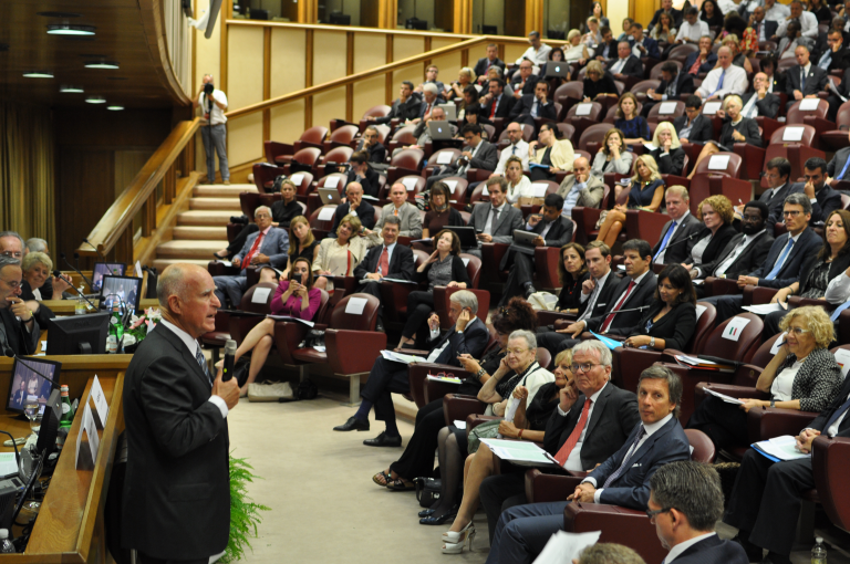 VATICAN CITY – Speaking on the first day of the Vatican’s symposium on climate change and modern slavery hosted by the Pontifical Academies of Sciences and Social Sciences, Governor Edmund G. Brown Jr. today urged the world’s mayors to “light a fire” and join California in the fight against climate change.