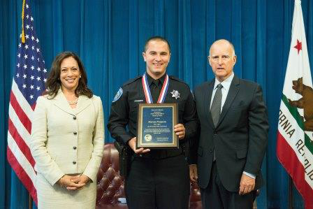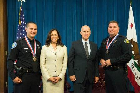 SACRAMENTO – Governor Edmund G. Brown Jr. joined Attorney General Kamala D. Harris today to present the Public Safety Officer Medal of Valor to Sonora Police Department Officer Ryan D. Webb and San Bernardino Police Department Officer Marcus Pesquera, who went above and beyond the call of duty.