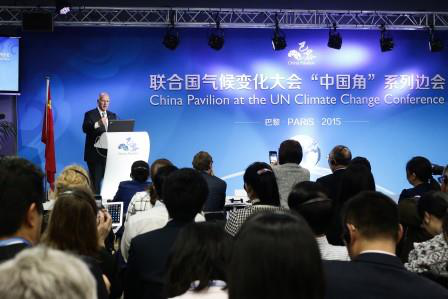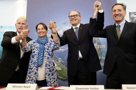 Prior to the event at the China Pavilion, Governor Brown joined France’s Minister of Ecology, Sustainable Development and Energy Ségolène Royal, Washington Governor Jay Inslee and Vermont Governor Peter Shumlin at the French Pavilion in the green zone at Le Bourget, an event hosted by the French government to highlight aggressive climate action amongst American states. At the conclusion of the event, the leaders signed a joint declaration to confirm their commitment to cooperate and support exchanges on sustainable economic development, climate change and related technologies and policies.