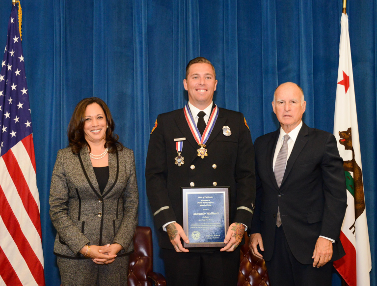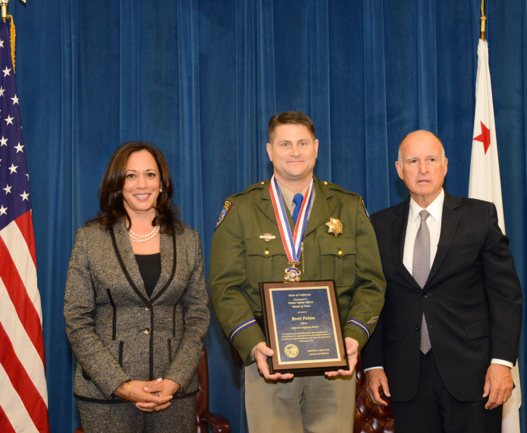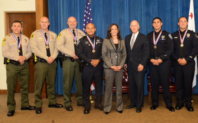 SACRAMENTO – Governor Edmund G. Brown Jr. joined Attorney General Kamala D. Harris today to present the Public Safety Officer Medal of Valor to eight public safety officials from the California Highway Patrol, San Bernardino County Sheriff’s Department, San Bernardino Police Department, San Diego Fire-Rescue Department and the Redlands Police Department, who went above and beyond the call of duty.
