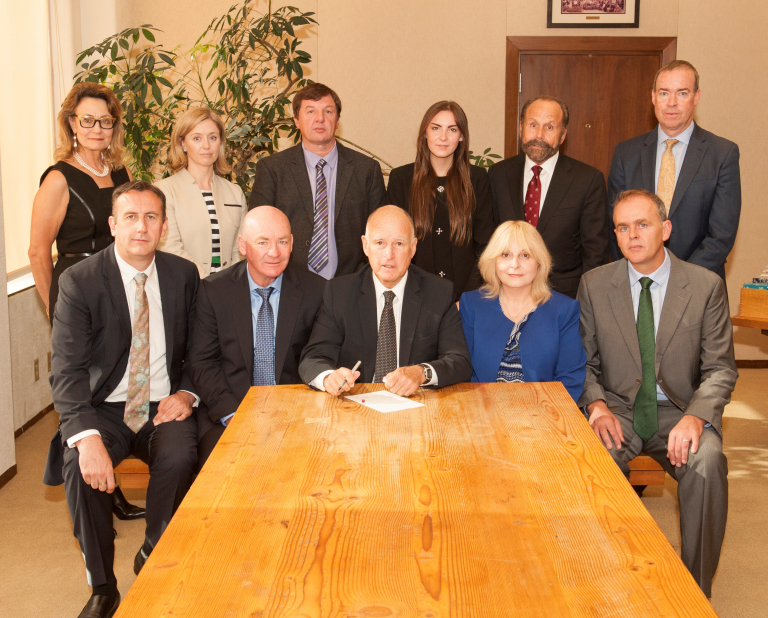 1.) Top row: Left to right: California Government Operations Agency Secretary Marybel Batjer, Irish Immigration Pastoral Center President Celine Kennelly, Dermot Burke (Olivia Burke uncle), Amanda Donohoe (Ashley Donohoe sister), Senator Hill, Alameda County chief assistant district attorney Kevin Dunleavy. Bottom row: Left to right: Irish Consul General in San Francisco Philip Grant, George Donohoe (Ashley Donohoe father), Governor Brown, Jackie Donohoe (Ashley Donohoe mother), Irish Department of Foreign Affairs and Trade Minister of State Joe McHugh.