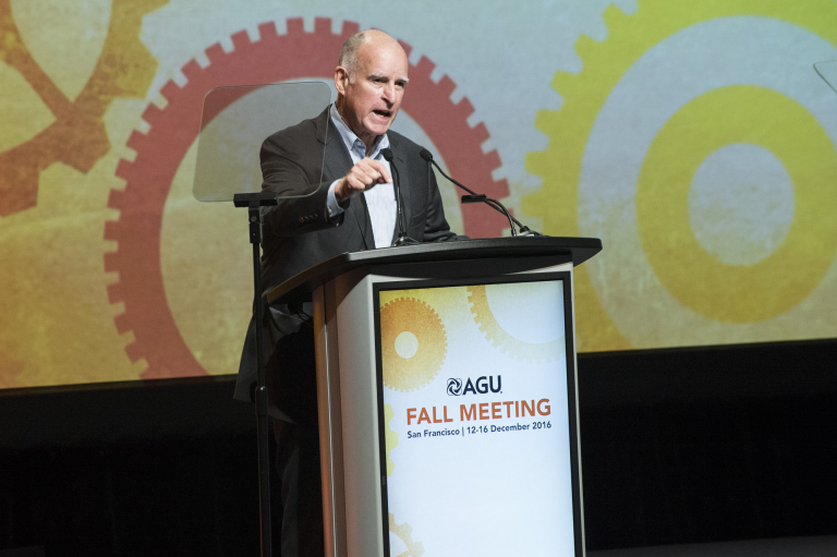“The time has never been more urgent or your work never more important. The climate is changing, temperatures are rising, oceans are becoming more acidified, habitats are under stress – the world is facing tremendous danger,” said Governor Brown at the American Geophysical Union’s annual fall meeting in San Francisco. “It’ll be up to you as truth-tellers, truth seekers to mobilize all your efforts to fight back. We’ve got a lot of firepower. We’ve got the scientists, we’ve got the universities, we have the national labs and we have the political clout and sophistication for the battle – and we will persevere. Have no doubt about that.”