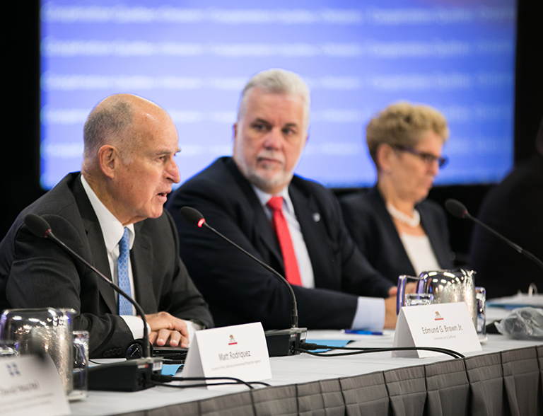 QUEBEC CITY – Governor Edmund G. Brown Jr. today signed an agreement with the leaders of Quebec and Ontario to officially integrate their cap-and-trade programs, expanding the three-year partnership between California and Quebec to include Ontario, Canada’s most populous province and leading industrial region. The agreement takes effect January 1, 2018.