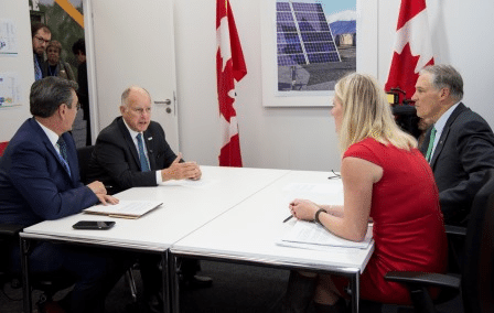 COP23 Special Advisor for States and Regions Governor Brown and Washington Governor Jay Inslee, representing the U.S. Climate Alliance, met with Mexico’s Undersecretary of Planning and Environmental Policy in the Ministry of the Environment and Natural Resources Rodolfo Lacy Tamayo and Canada’s Minister of Environment and Climate Change Catherine McKenna at the Canadian delegation’s office located directly across from the United States’ office in COP23’s Bula Zone. Meeting participants discussed ongoing negotiations at COP23 and reaffirmed the commitment of Canada, Mexico and members of the U.S. Climate Alliance to climate action and further collaboration across North America.