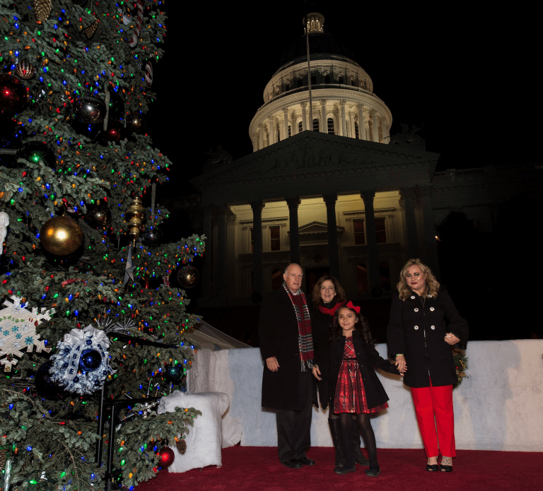 This year, the Governor and First Lady lit the Capitol Christmas tree with 7-year-old Sofia Garcia of Los Angeles. The tree is illuminated by approximately 10,000 ultra-low wattage LED lights and decorated with more than 900 hand-crafted ornaments made by children and adults with developmental disabilities who receive services and support from the state’s development centers and 21 nonprofit regional centers.