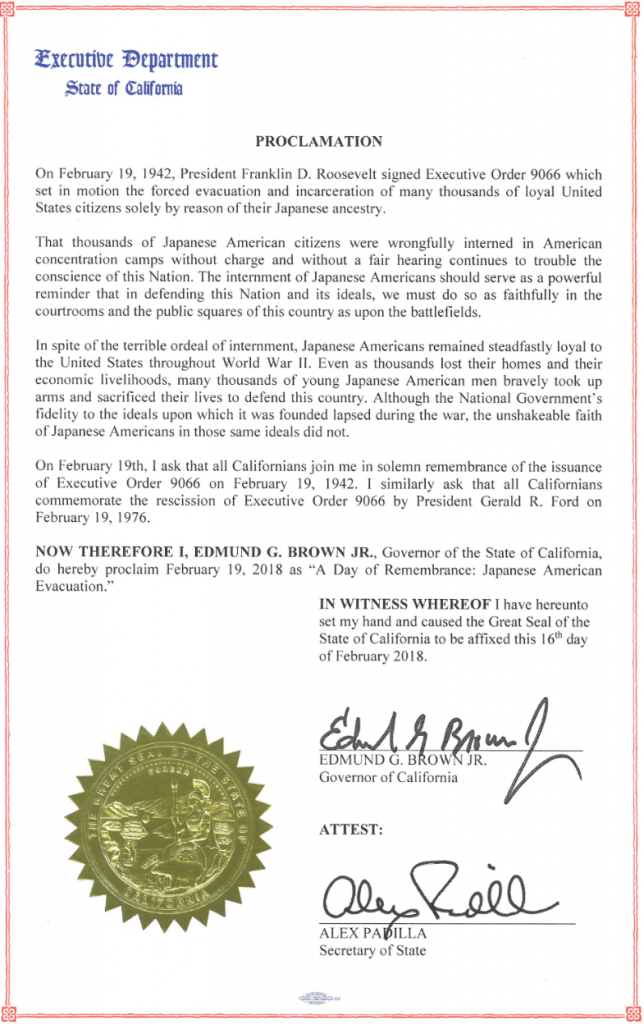 SACRAMENTO – Governor Edmund G. Brown Jr. today issued a proclamation declaring February 19, 2018, as A Day of Remembrance: Japanese American Evacuation in the State of California.