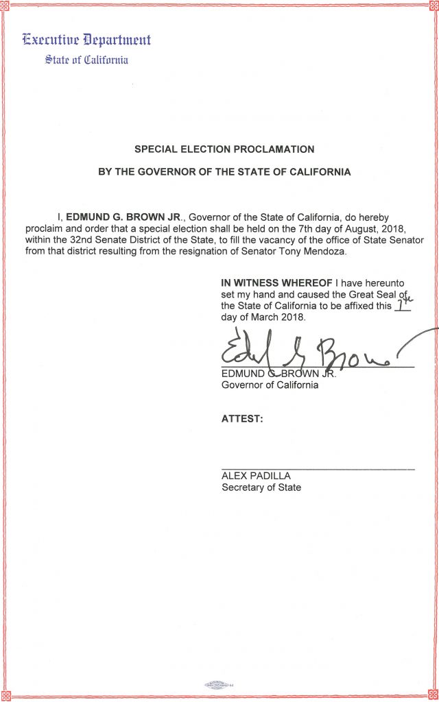 I, EDMUND G. BROWN JR., Governor of the State of California, do hereby proclaim and order that a special election shall be held on the 7th day of August, 2018, within the 32nd Senate District of the State, to fill the vacancy of the office of State Senator from that district resulting from the resignation of Senator Tony Mendoza.