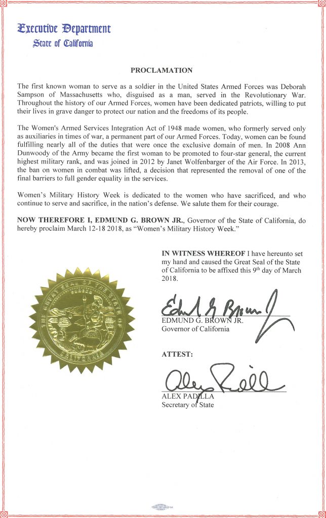 NOW THEREFORE I, EDMUND G. BROWN JR., Governor of the State of California, do hereby proclaim March 12-18 2018, as “Women’s Military History Week.”