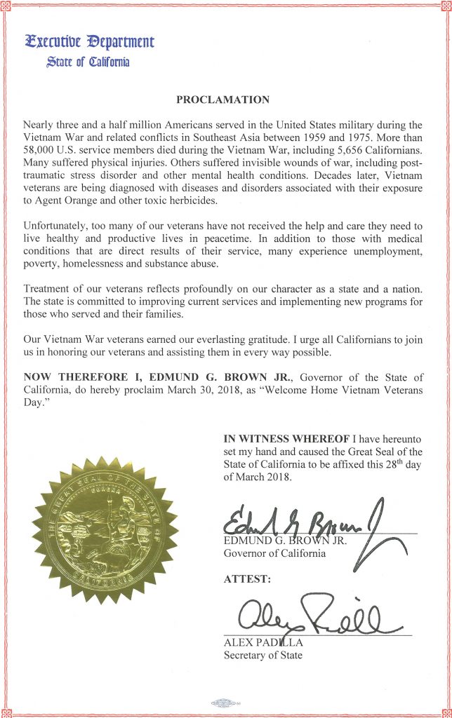 SACRAMENTO – Governor Edmund G. Brown Jr. today issued a proclamation declaring tomorrow, March 30, 2018, as “Welcome Home Vietnam Veterans Day” in the State of California.