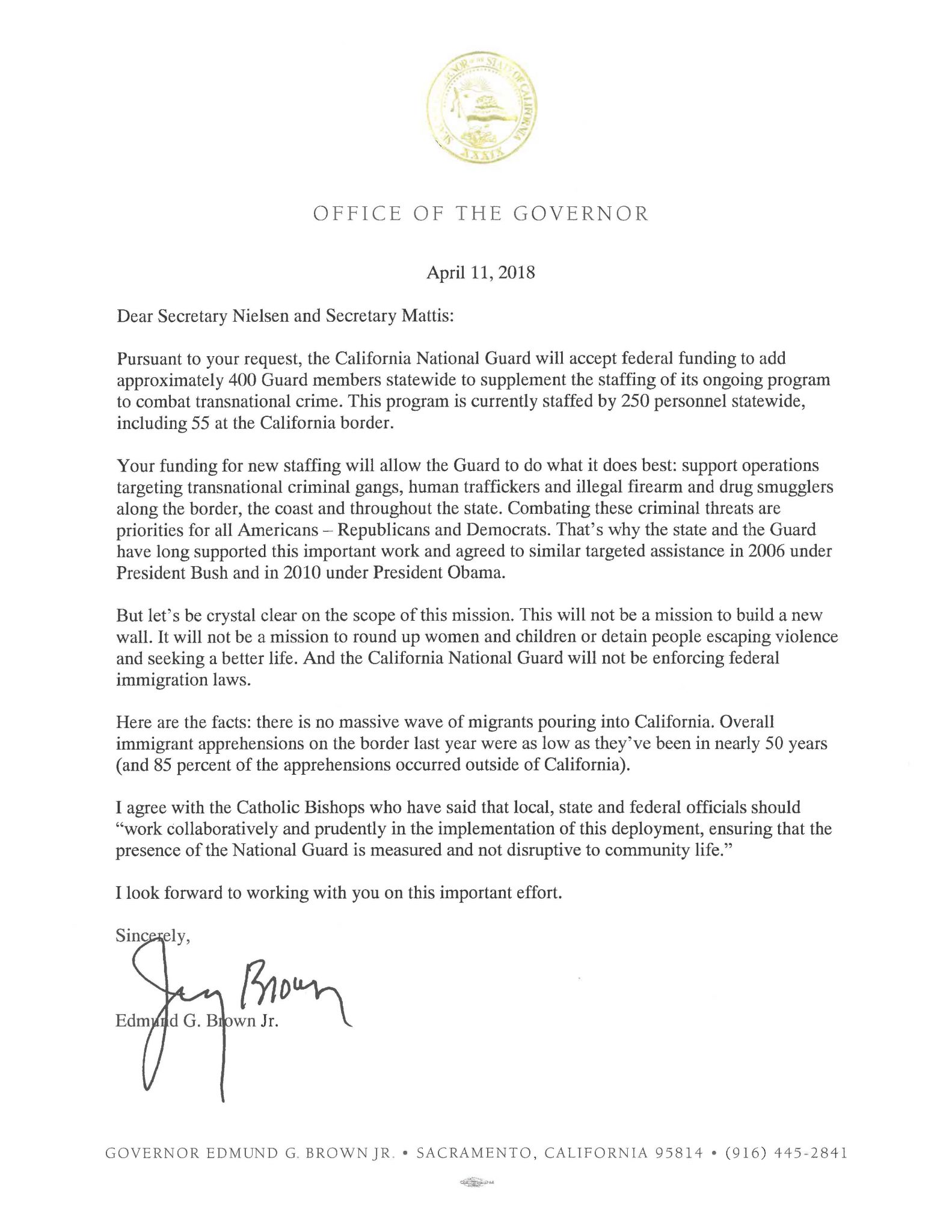 SACRAMENTO – Governor Edmund G. Brown Jr. today responded to the federal government’s request for additional California National Guard personnel with the following letter. The accompanying agreement, submitted this afternoon for review and approval by the federal government, can be found here.
