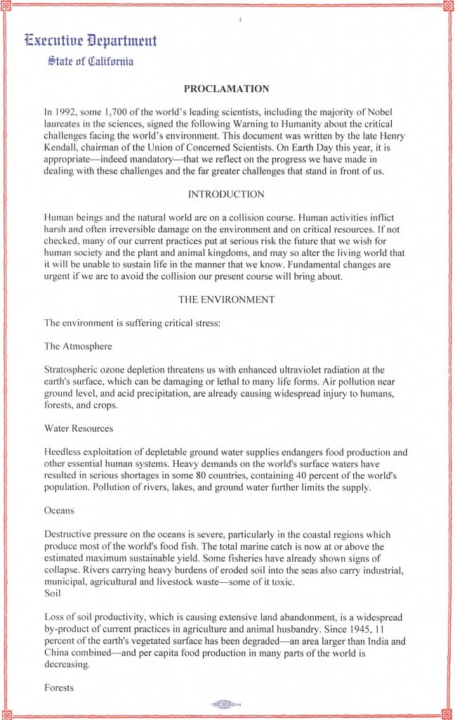 In 1992, some 1,700 of the world’s leading scientists, including the majority of Nobel laureates in the sciences, signed the following Warning to Humanity about the critical challenges facing the world’s environment. This document was written by the late Henry Kendall, chairman of the Union of Concerned Scientists. On Earth Day this year, it is appropriate—indeed mandatory—that we reflect on the progress we have made in dealing with these challenges and the far greater challenges that stand in front of us.