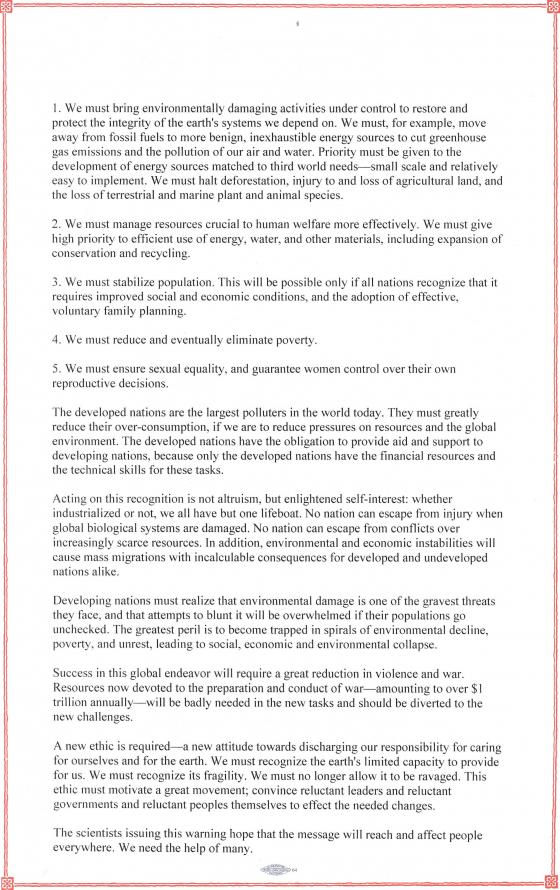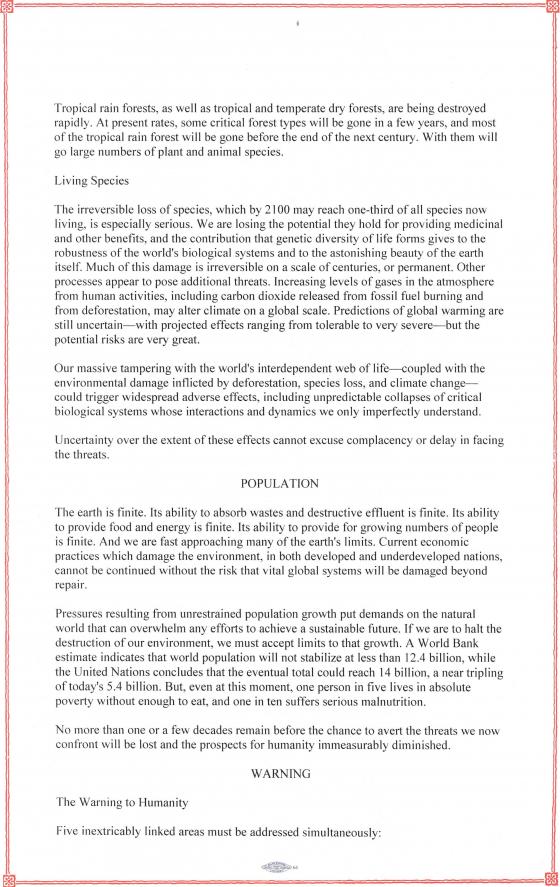 Human beings and the natural world are on a collision course. Human activities inflict harsh and often irreversible damage on the environment and on critical resources. If not checked, many of our current practices put at serious risk the future that we wish for human society and the plant and animal kingdoms, and may so alter the living world that it will be unable to sustain life in the manner that we know. Fundamental changes are urgent if we are to avoid the collision our present course will bring about.