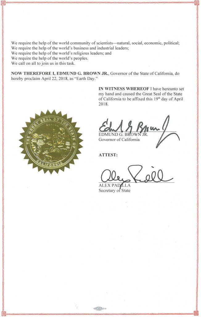 NOW THEREFORE I, EDMUND G. BROWN JR., Governor of the State of California, do hereby proclaim April 22, 2018, as “Earth Day.”