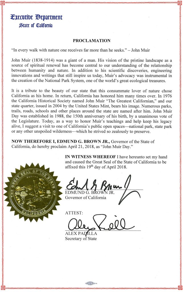 SACRAMENTO – Governor Edmund G. Brown Jr. today issued a proclamation declaring April 21, 2018 as “John Muir Day” in the State of California.