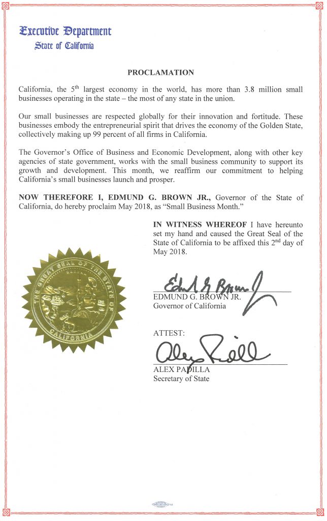SACRAMENTO – Governor Edmund G. Brown Jr. today issued a proclamation declaring May 2018 as “Small Business Month” in the State of California.