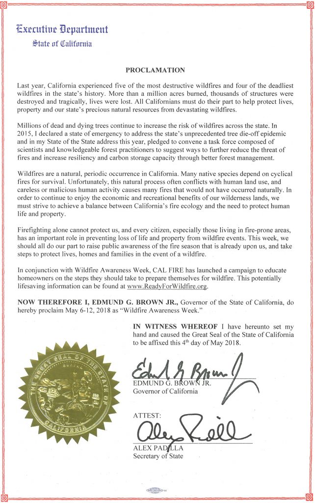 NOW THEREFORE I, EDMUND G. BROWN JR., Governor of the State of California, do hereby proclaim May 6-12, 2018 as “Wildfire Awareness Week.”