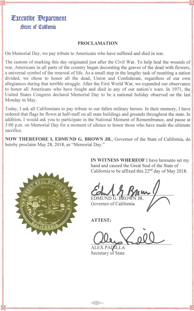 SACRAMENTO – Governor Edmund G. Brown Jr. today issued a proclamation declaring Monday, May 28, 2018 as Memorial Day in the State of California.
