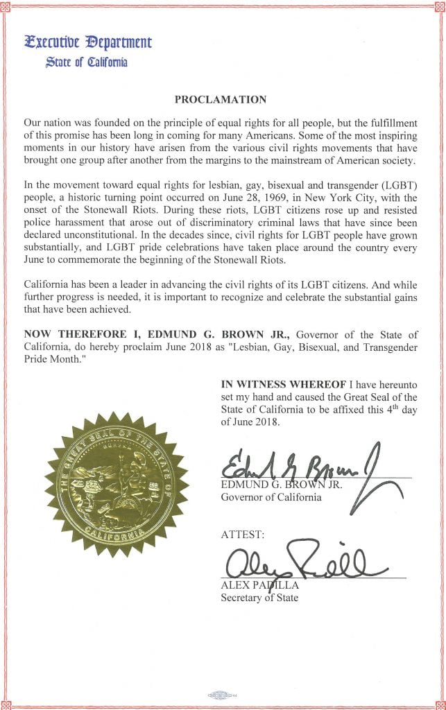 NOW THEREFORE I, EDMUND G. BROWN JR., Governor of the State of California, do hereby proclaim June 2018 as “Lesbian, Gay, Bisexual, and Transgender Pride Month.”