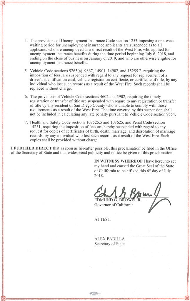 SACRAMENTO – Governor Edmund G. Brown Jr. today issued an emergency proclamation for San Diego County due to the effects of the West Fire, which has destroyed homes, threatened critical infrastructure and caused the evacuation of residents.