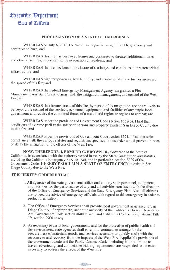 NOW, THEREFORE, I, EDMUND G. BROWN JR., Governor of the State of California, in accordance with the authority vested in me by the State Constitution and statutes, including the California Emergency Services Act, and in particular, section 8625 of the Government Code, HEREBY PROCLAIM A STATE OF EMERGENCY to exist in San Diego County due to the West Fire.