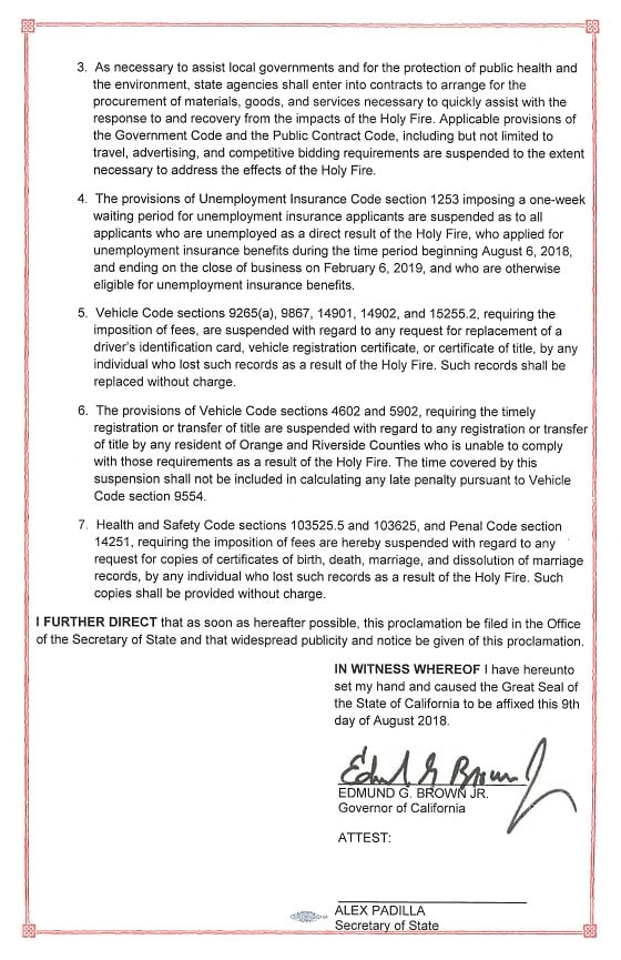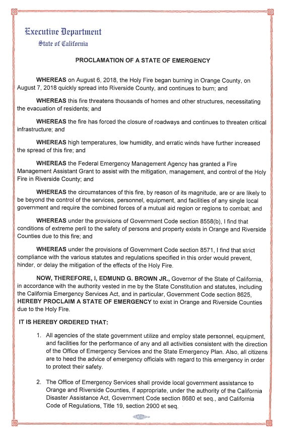 SACRAMENTO – Governor Edmund G. Brown Jr. today issued an emergency proclamation for Orange and Riverside counties due to the effects of the Holy Fire, which has threatened critical infrastructure, thousands of homes and other structures and has caused the evacuation of residents.