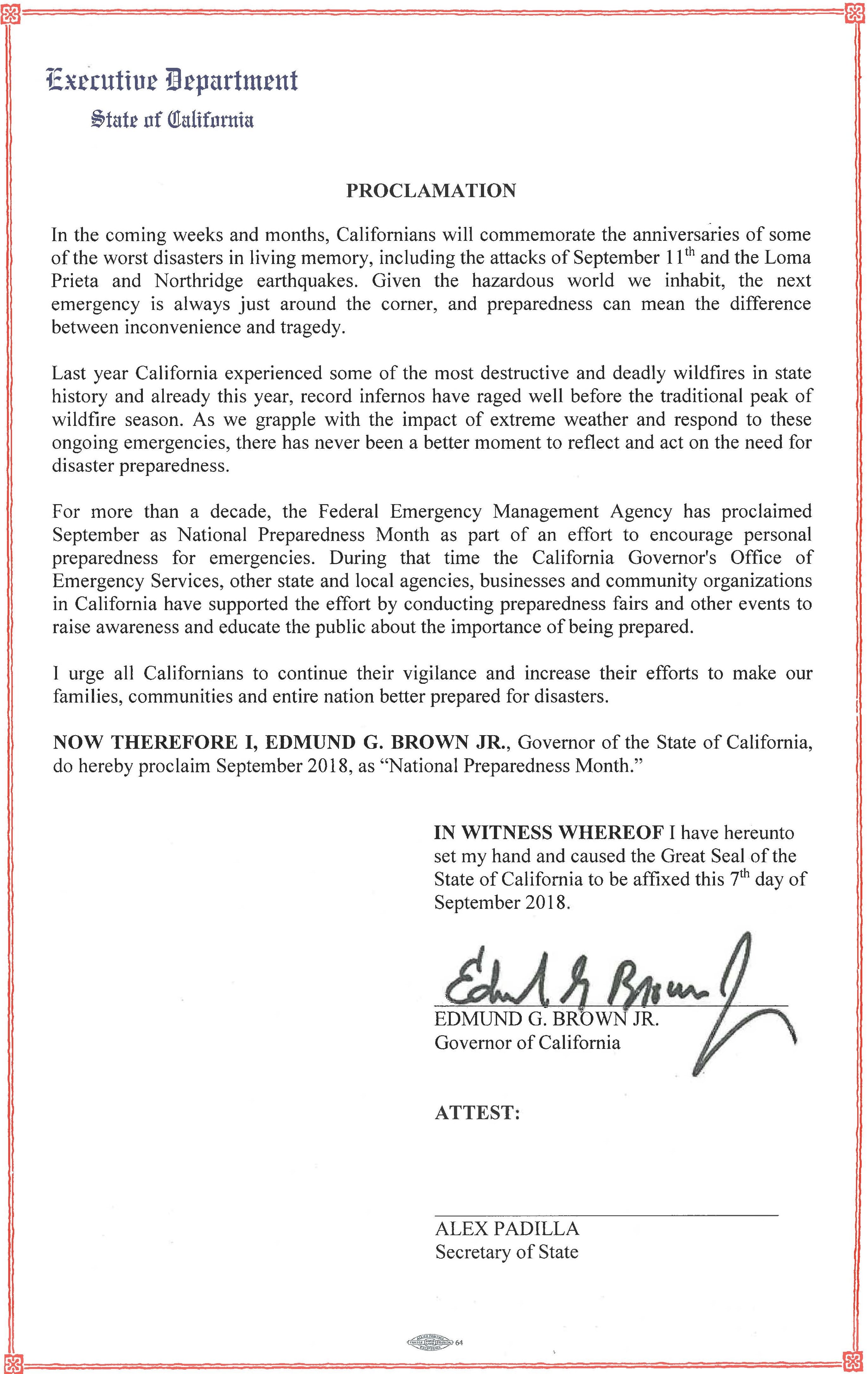 SACRAMENTO – Governor Edmund G. Brown Jr. today issued a proclamation declaring September 2018 as “National Preparedness Month” in the State of California.